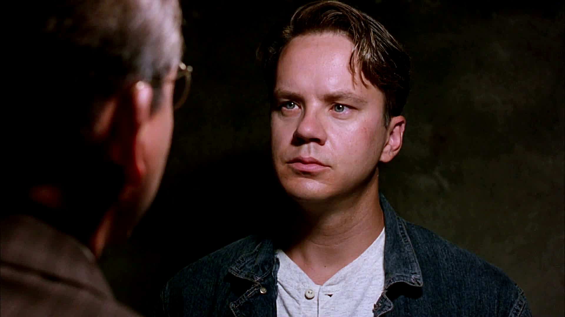 Description: A man in a denim jacket looking at another man in a white shirt and jeans jacket in a dark room.