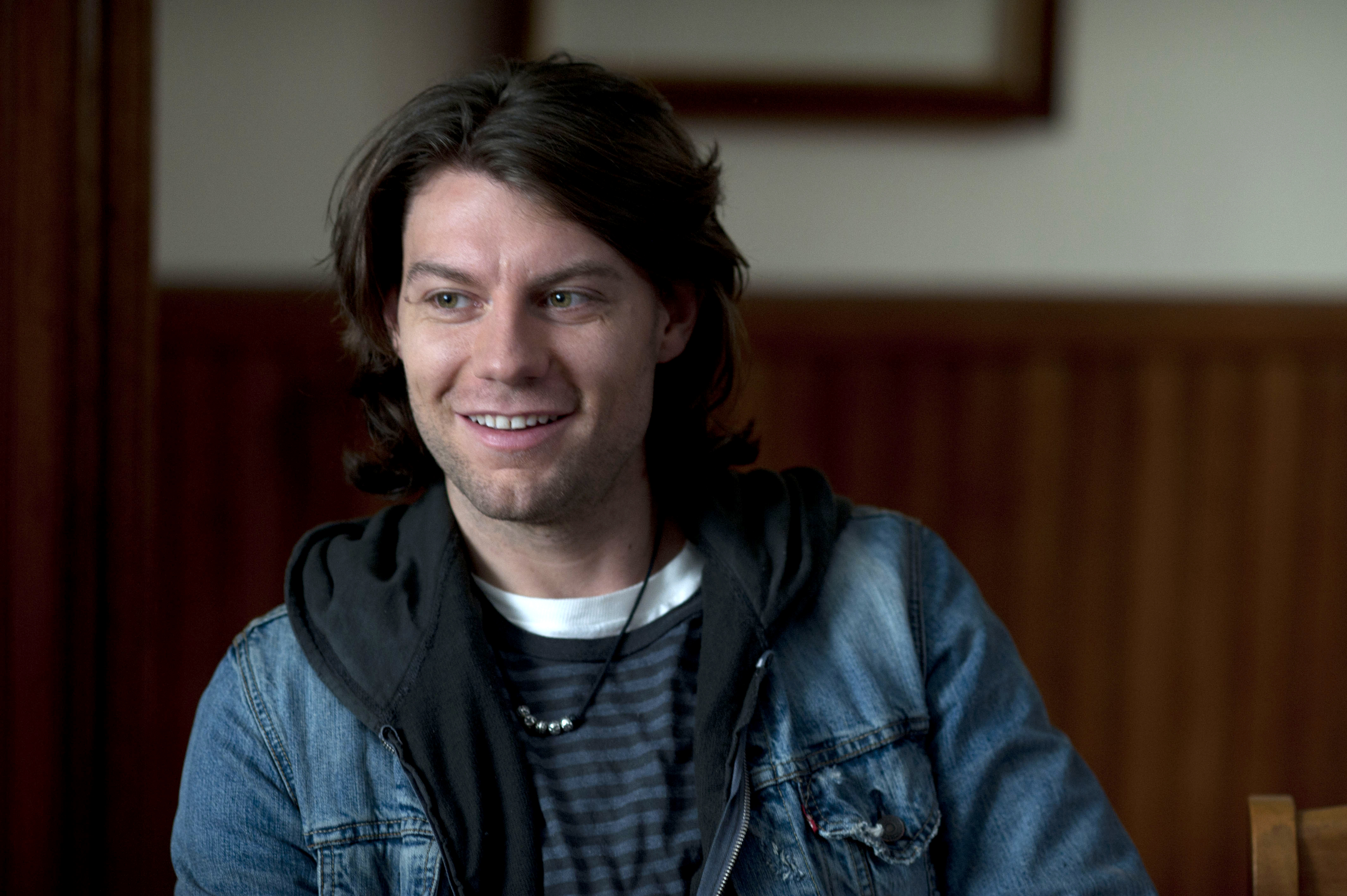 Description: A man with a denim jacket and a white shirt is smiling at the camera while sitting in a chair.