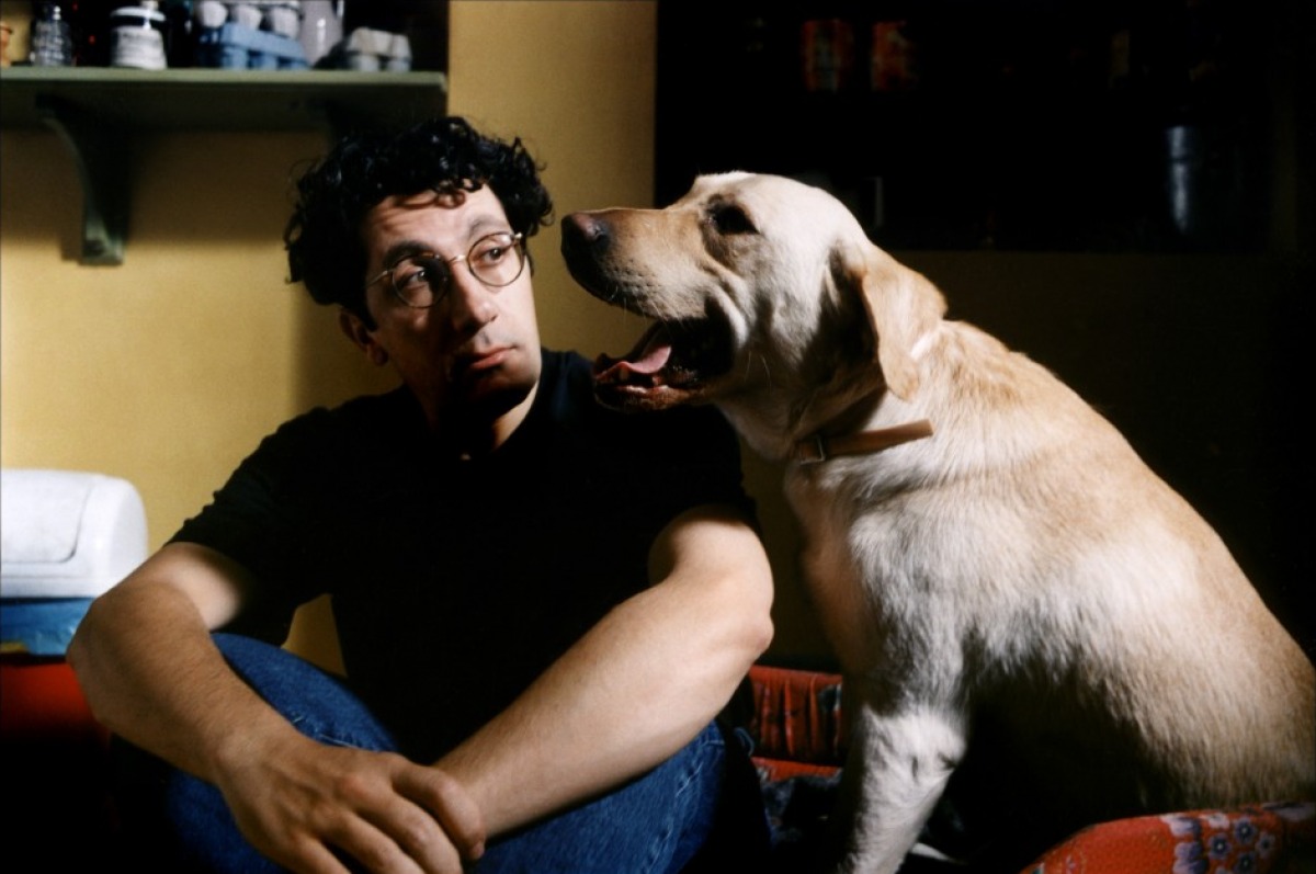 Description: A man sitting on a couch with a dog next to him and a shelf with bottles on it behind him.