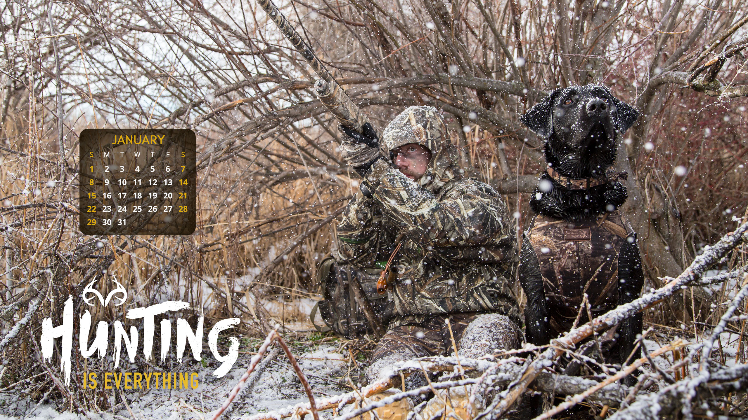 Description: A man and a dog in the snow with a hunting calendar on the back of the dog's head.