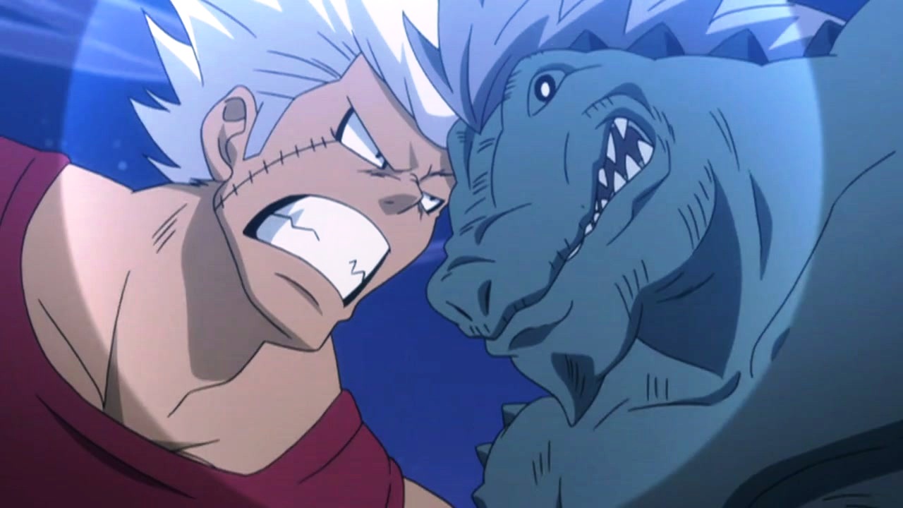 Description: A man with a dragon face and a demon face next to him.