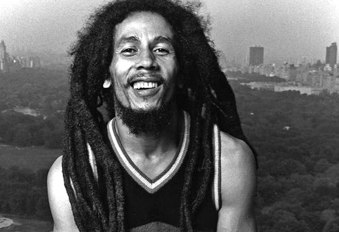 Description: A man with dreadlocks and a beard smiling in a black and white photo with a city in the background.