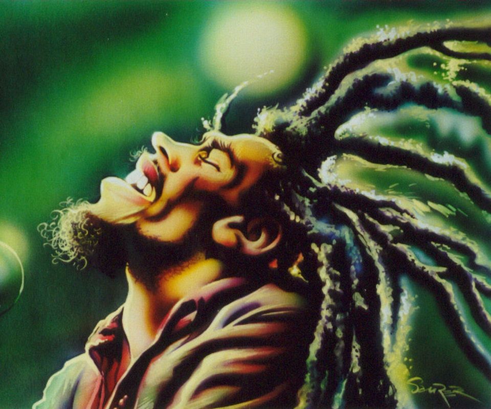 Description: A painting of a man with dreadlocks on his head and eyes closed.
