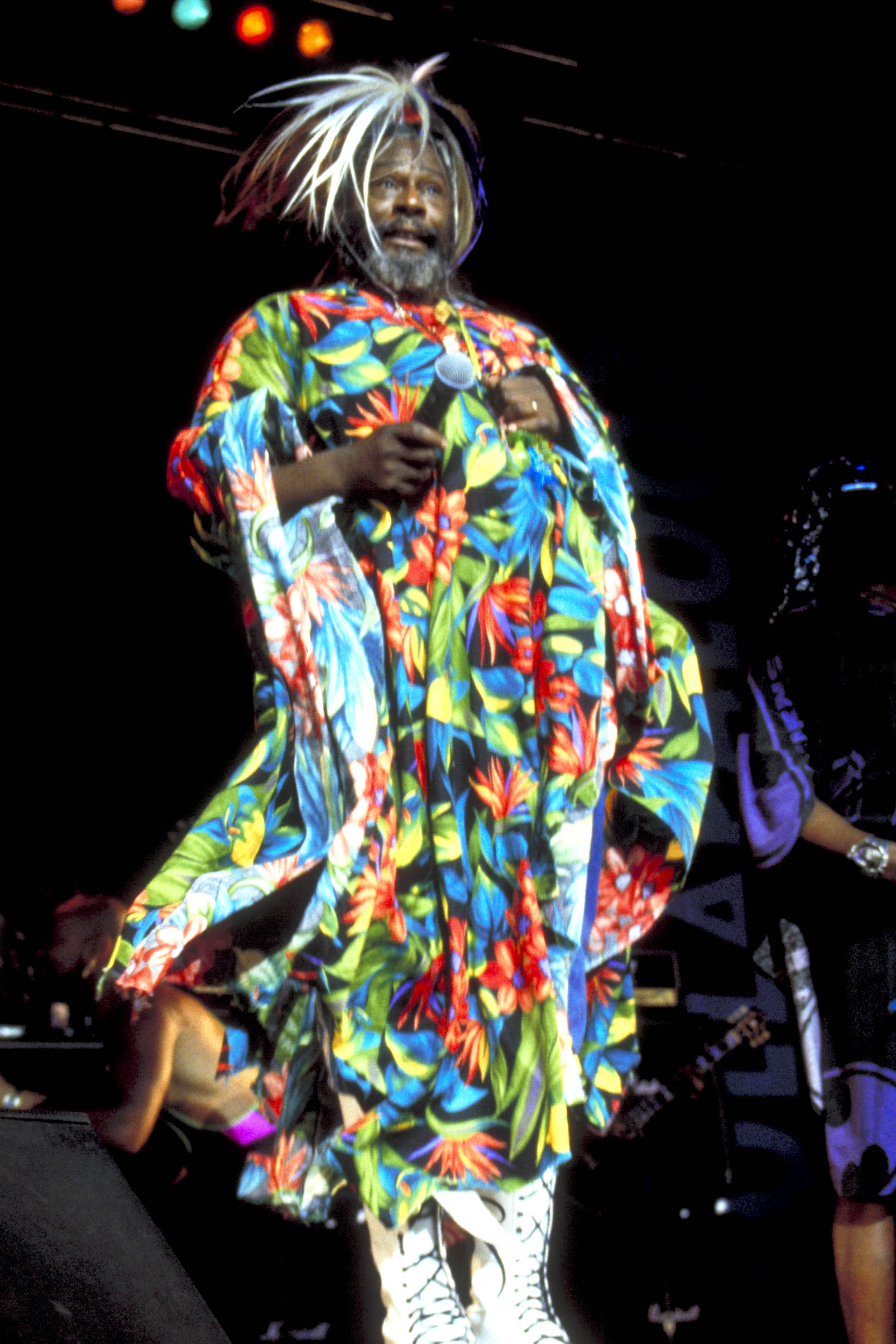 Description: A man with dreadlocks on a stage with a colorful outfit on and a woman in a black dress.