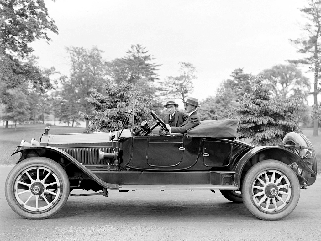 Description: A man driving a car down a street next to trees and bushes in a park area with a dog.