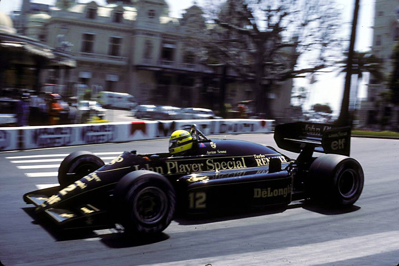 Description: A man driving a racing car down a street next to a tall building with a clock on it's side.