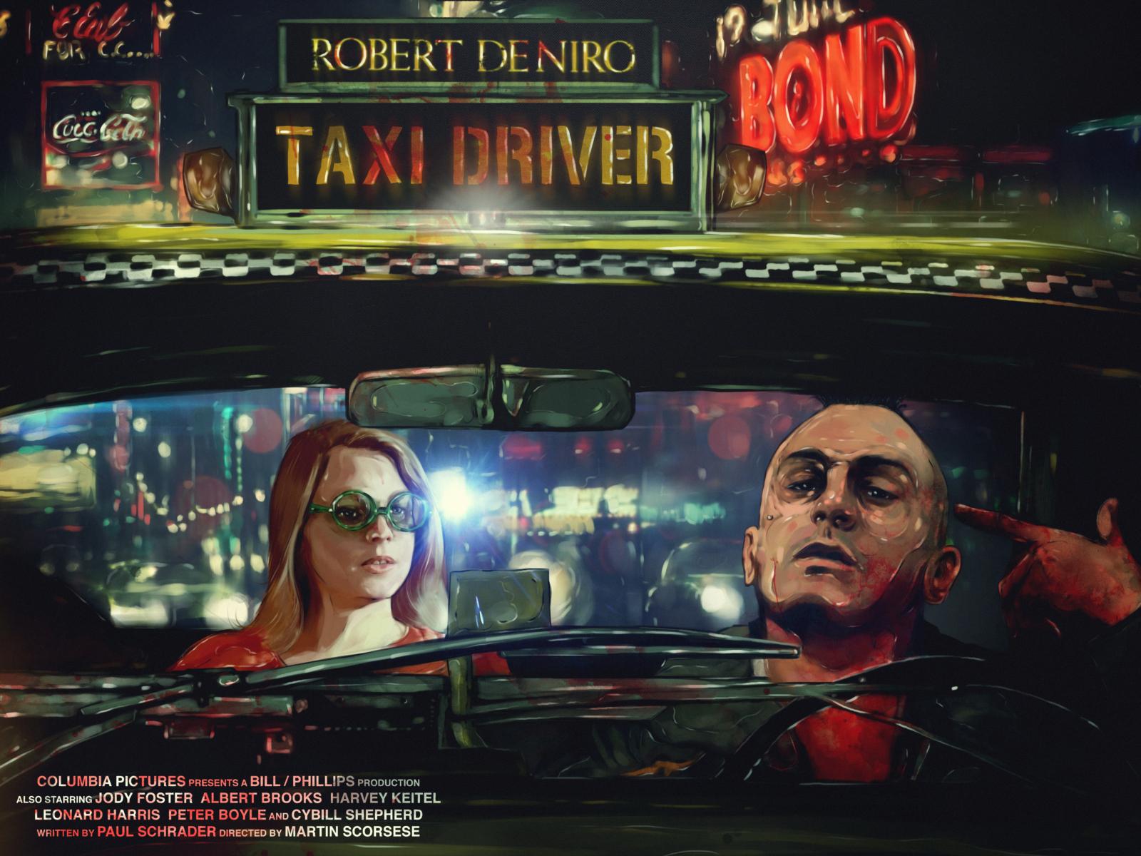 Description: A man driving a car next to a woman in a taxi cab in a city at night with neon signs.