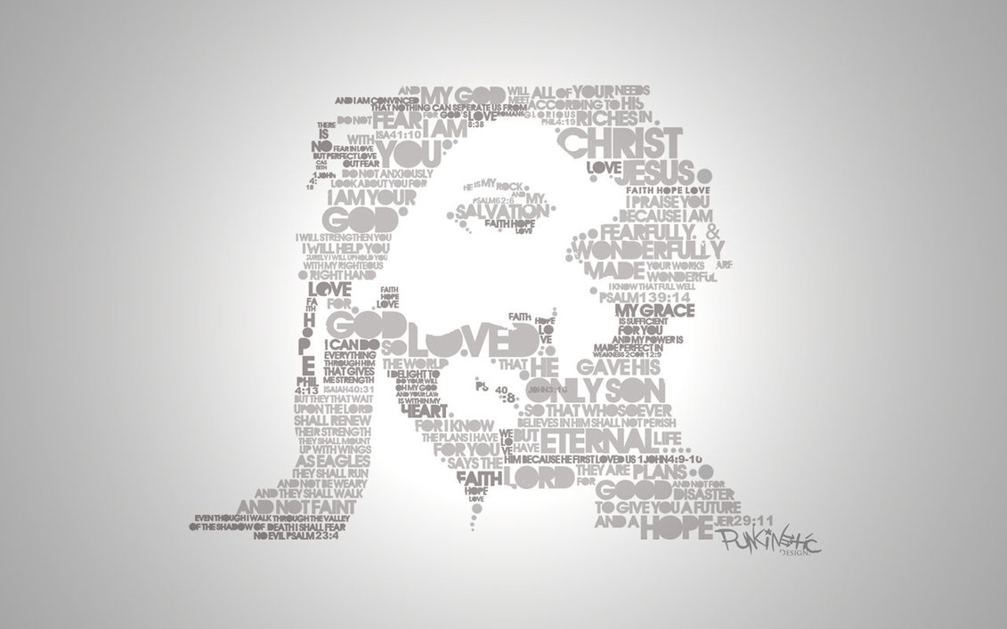 Description: A man's face with words written in it to describe the word jesus on a gray background with a white border.