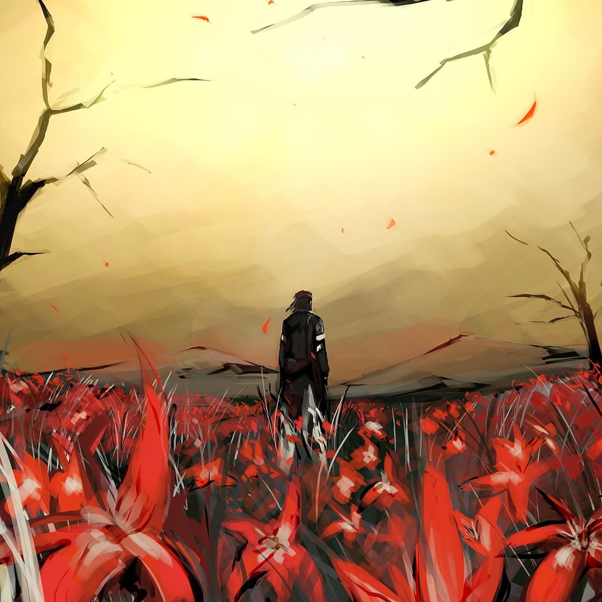 Description: A painting of a man standing in a field of flowers with a sunset in the background and a bird flying overhead.