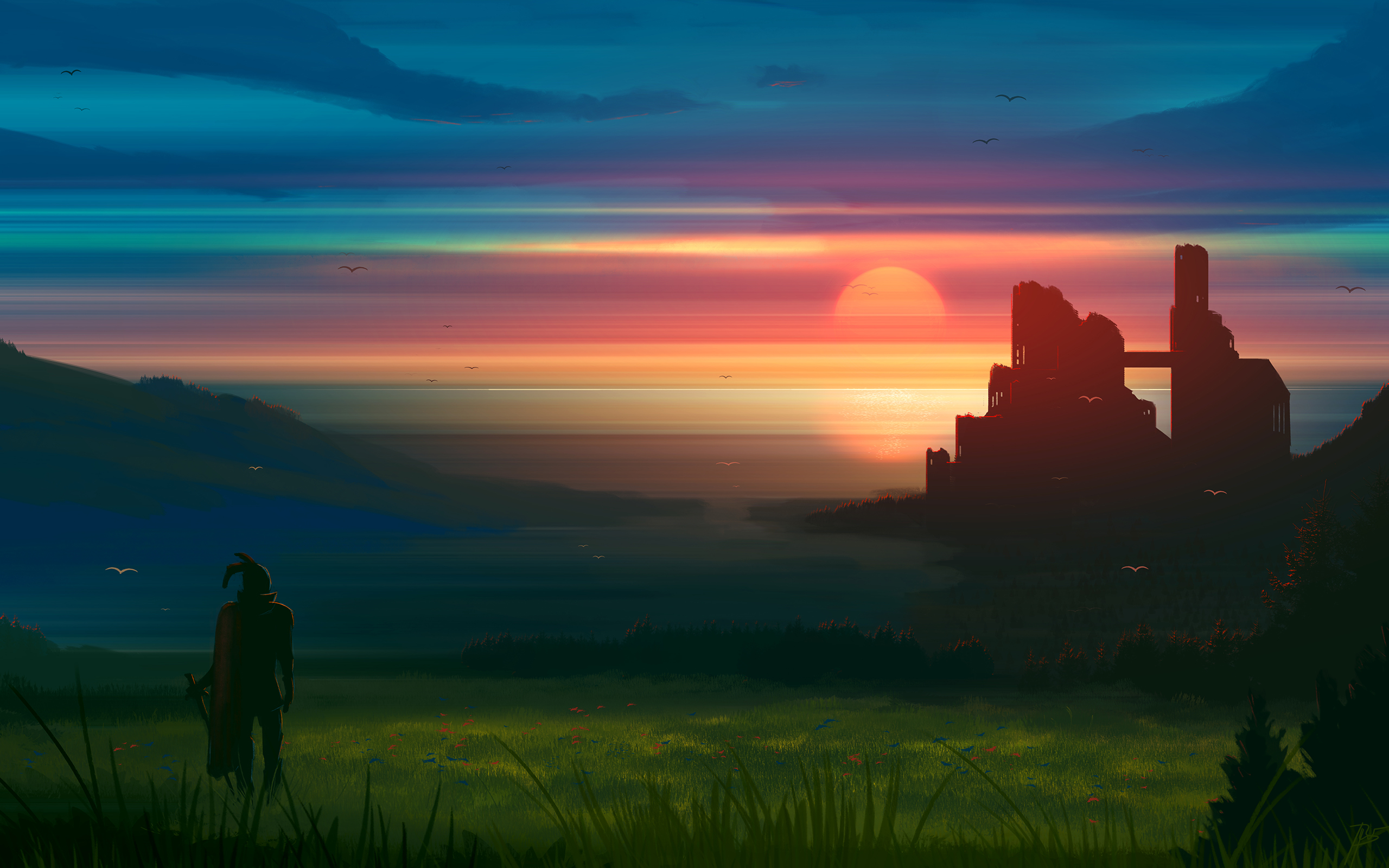 Description: A painting of a man standing in a field with a sunset in the background and a building in the foreground.