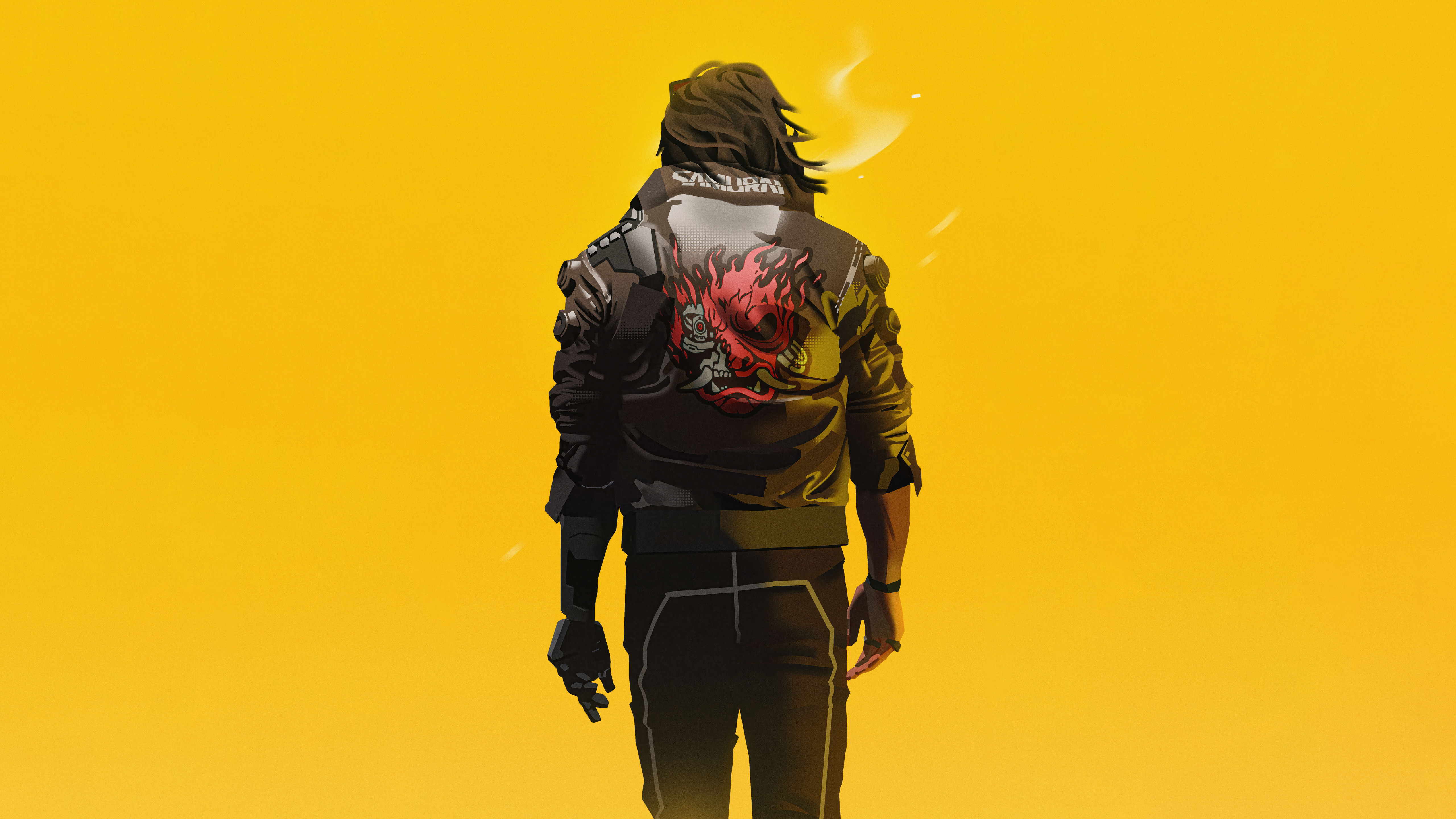 Description: A man in a black jacket and a yellow background with a red and black fire emblem on his back.