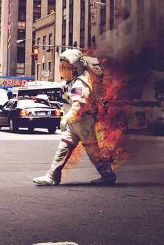 Description: A man in a fire suit walking down a street with a fireball in the air and a fire coming out of his mouth.
