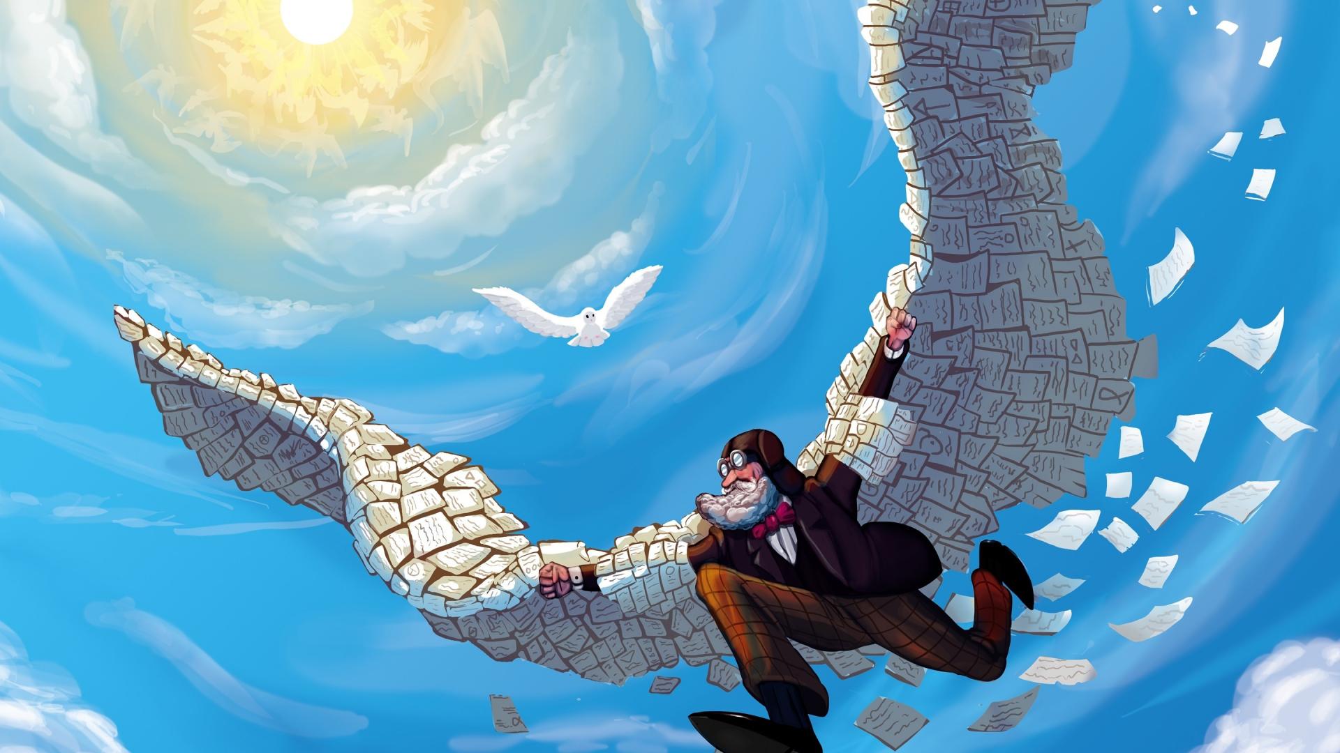 Description: A man flying through the air while riding a giant bird like object in the sky with papers flying around.