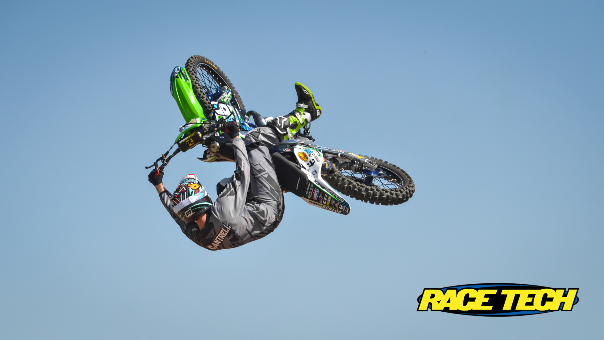 Description: A man flying through the air while riding a motorcycle in the air with a helmet on and a helmet on.