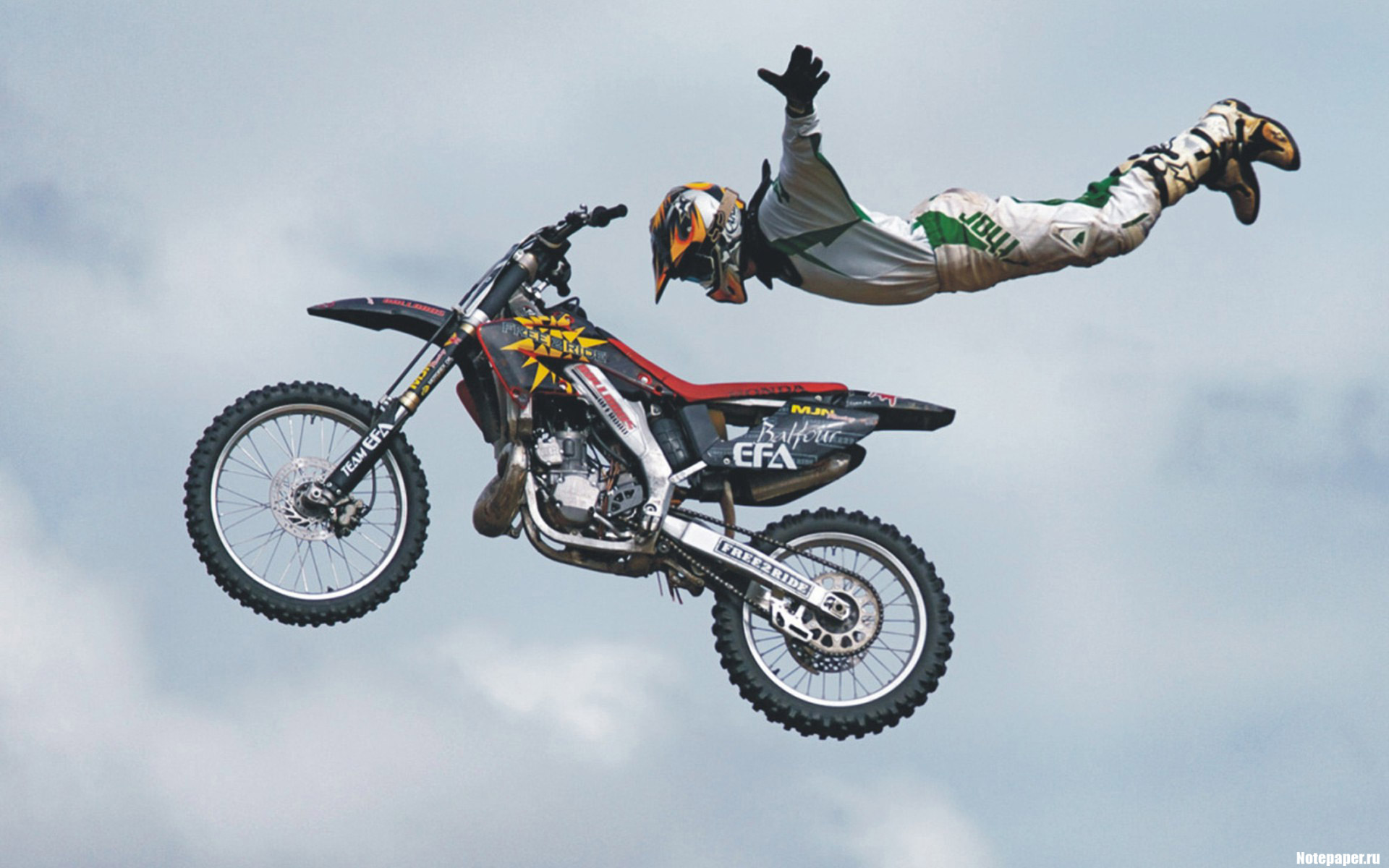 Description: A man flying through the air while riding a motorcycle in the air with a helmet on and a helmet on.