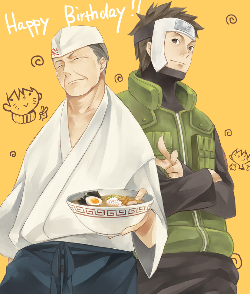 Description: A man holding a bowl of food next to another man wearing a green jacket and a white hat with a cat on his head.