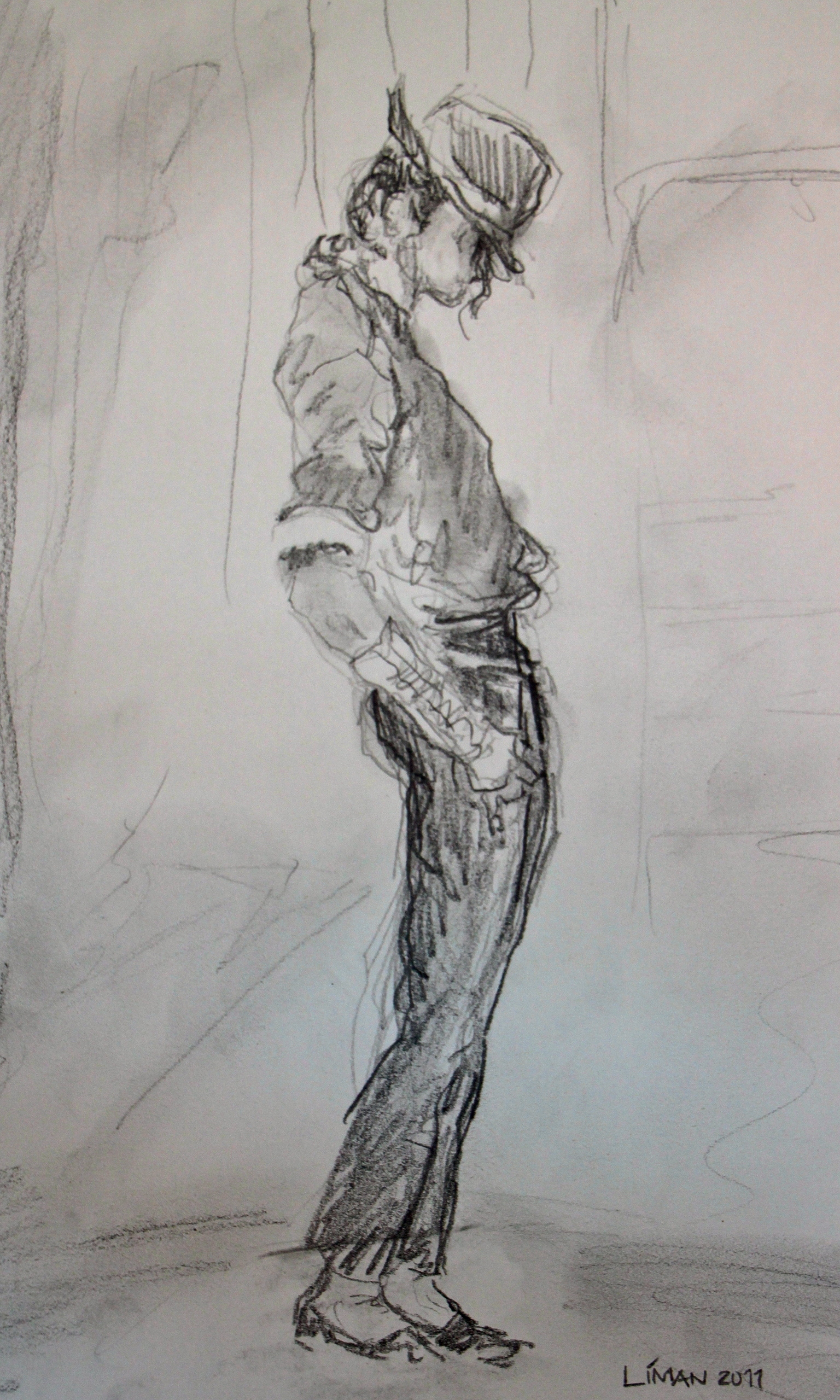 Description: A drawing of a man standing in a forest with his hands in his pockets and his hat on his head.
