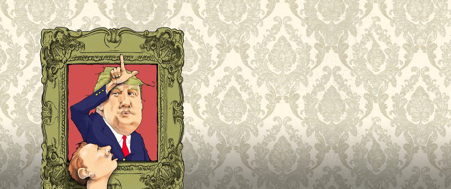 Description: A painting of a man in a frame with a picture of himself in it on a wallpapered wall.