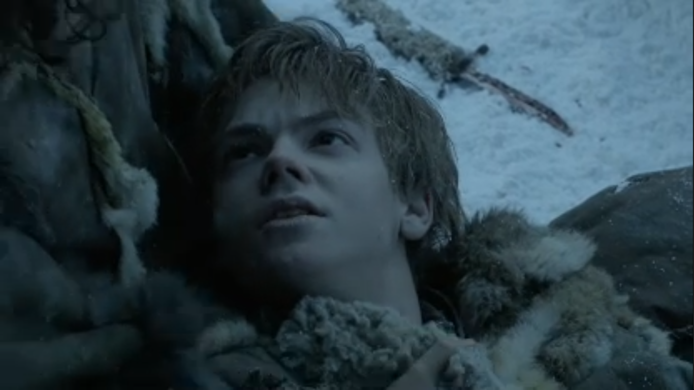 Description: A man in a fur coat is looking up at something in the distance with a knife in his hand.
