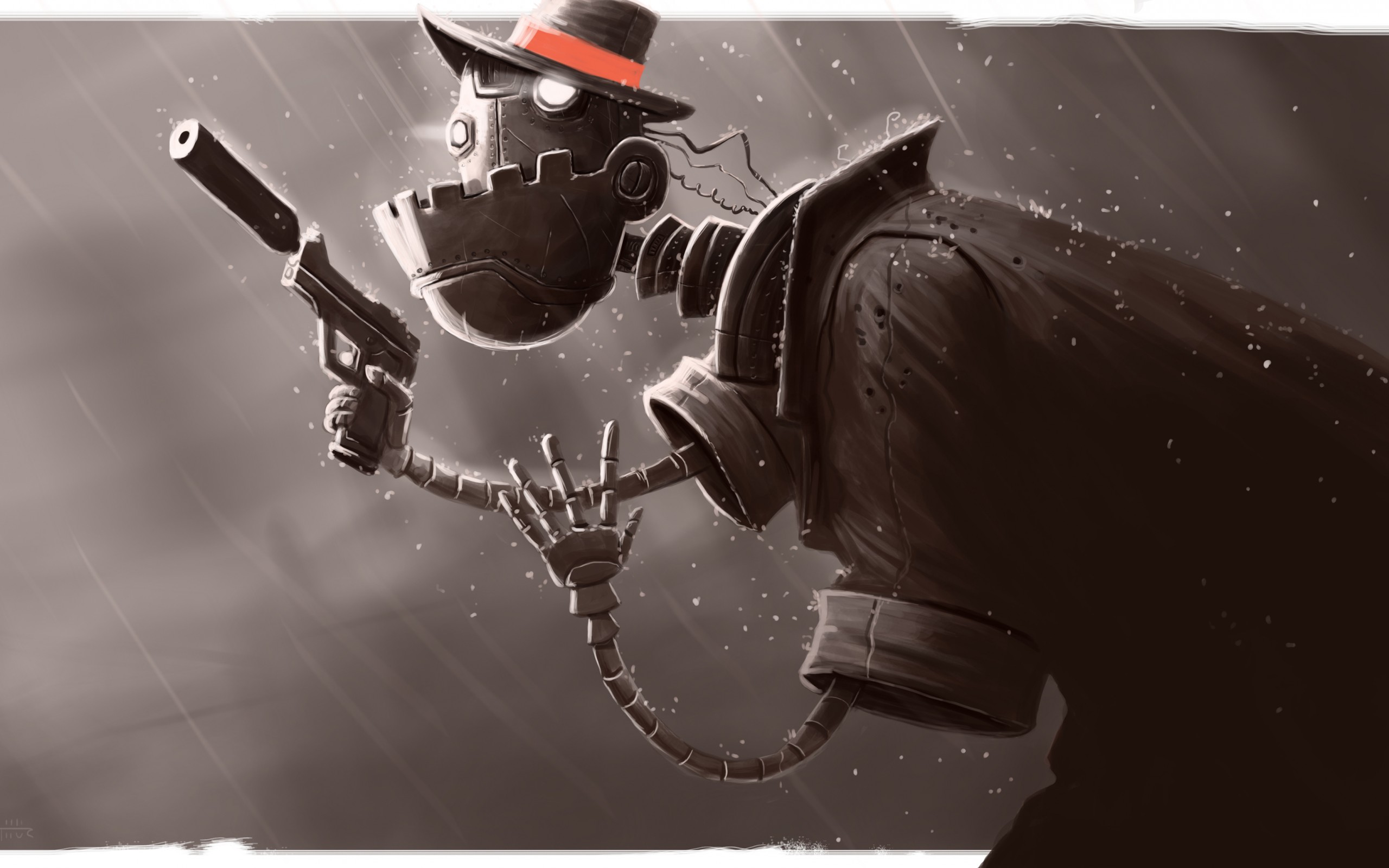 Description: A man in a gas mask holding a gun in the rain with a red hat on his head and a gas mask on his face.