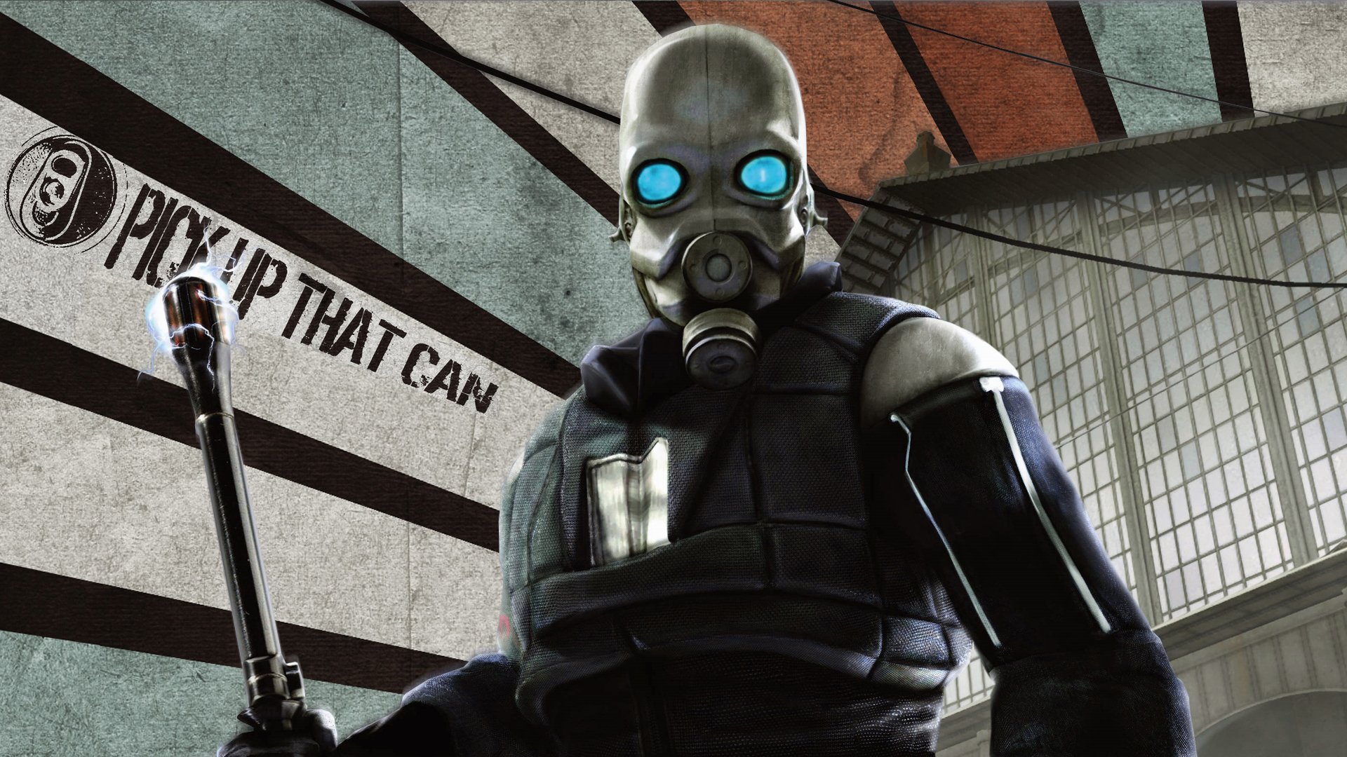 Description: A man in a gas mask holding two swords in front of a wall with a sign that says.