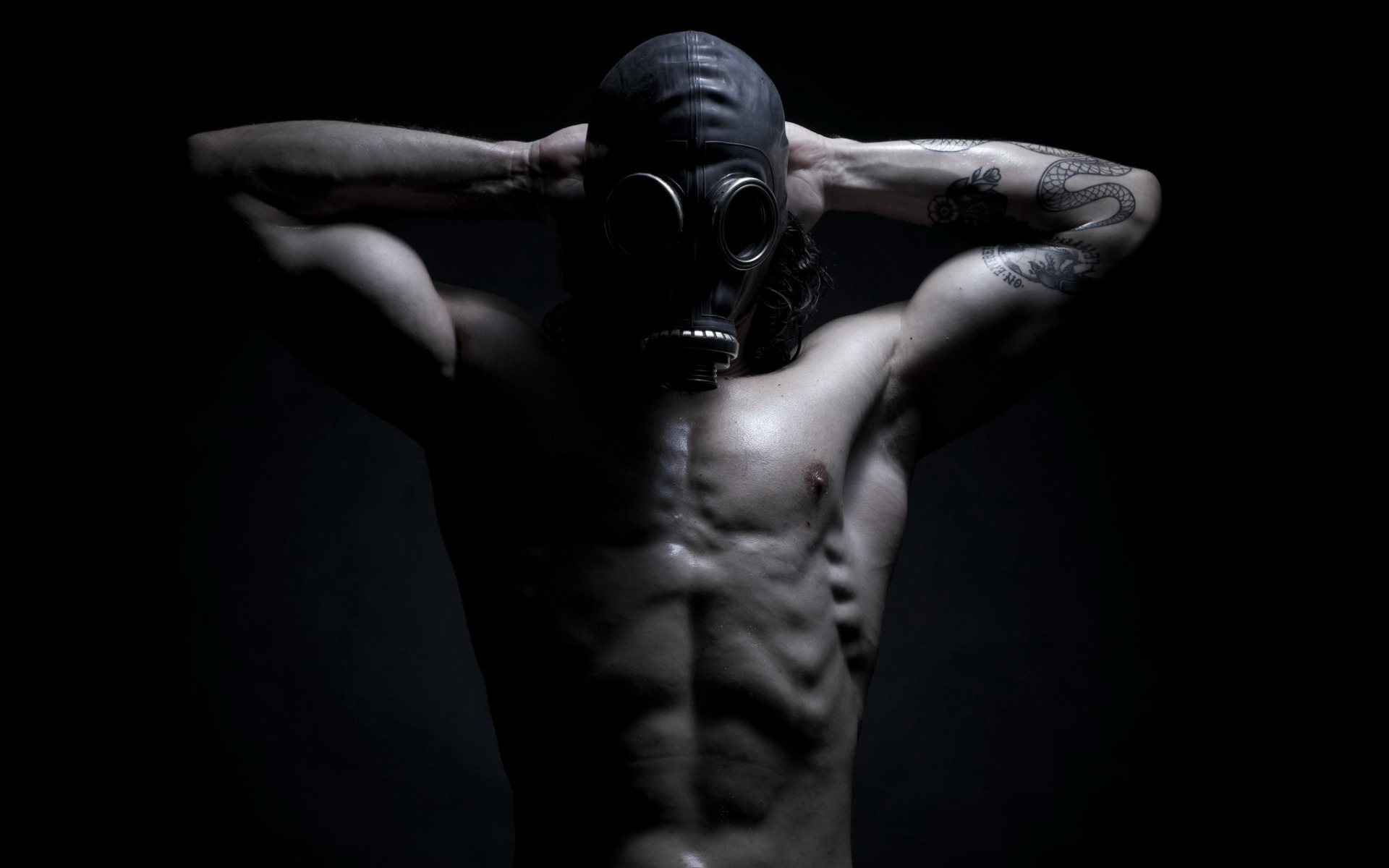 Description: A man with a gas mask on his head and a gas mask on his head is standing in the dark.