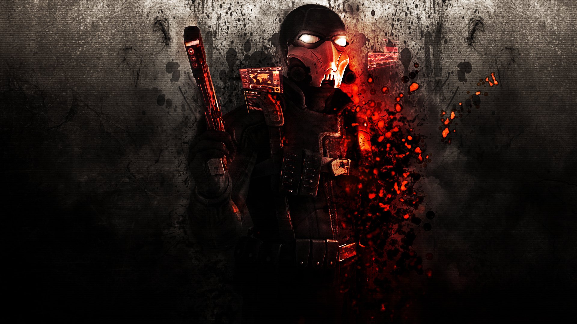 Description: A man in a gas mask holding a gun in his hand and a red light on his face is shining.