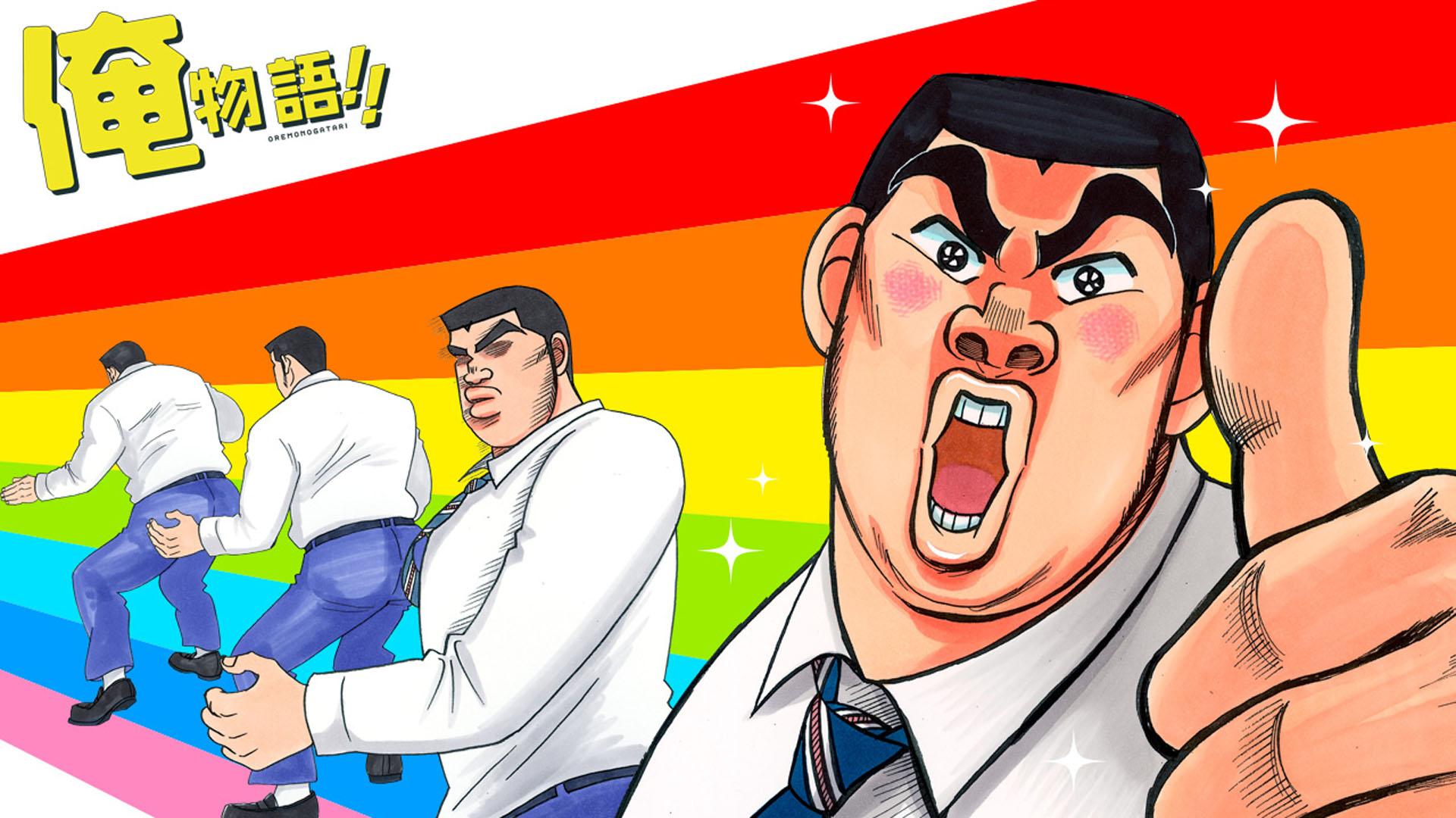 Description: A man making a gesture with his fingers in front of him and other men in the background with a rainbow background.