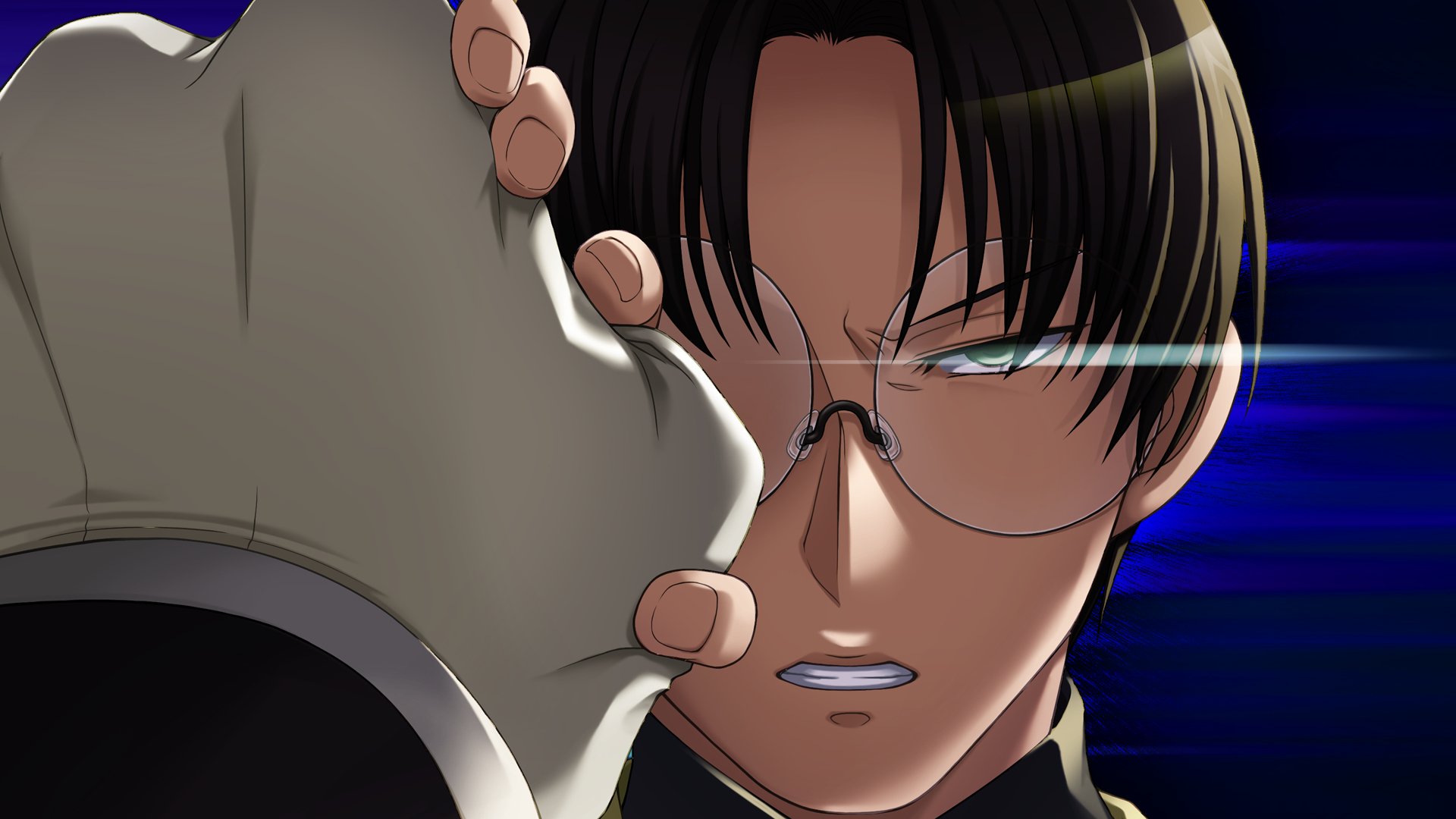 Description: A man with glasses and a black shirt holding his hand up to his face with a blue background behind him.