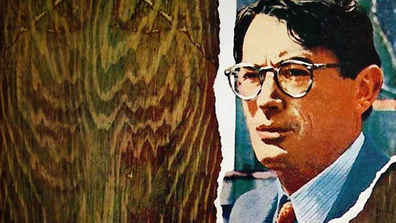 Description: A man wearing glasses and a tie standing next to a tree with a picture of him on it's side.