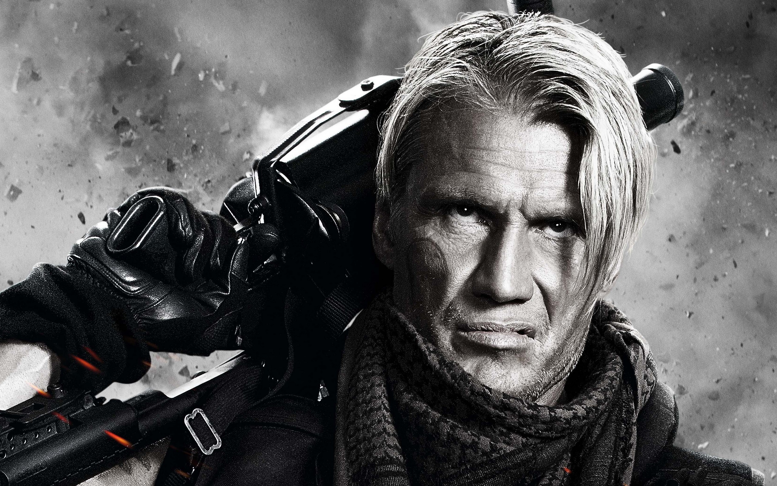 Description: A man with a gun and gloves on his shoulder in front of a black and white background with smoke.