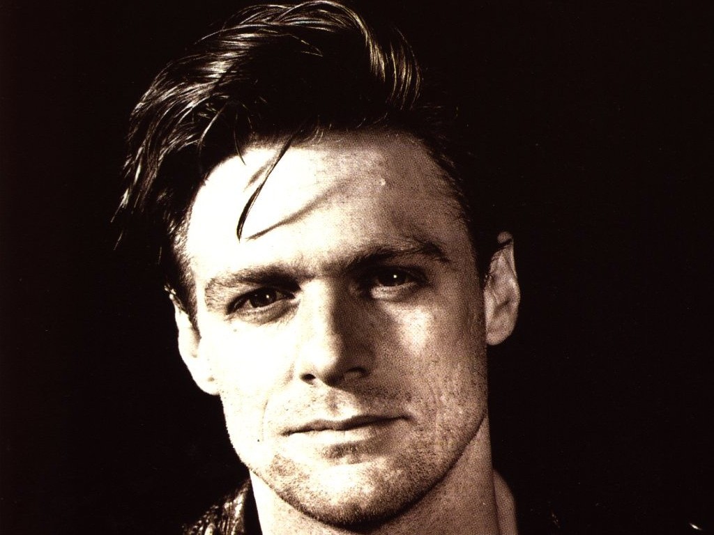 Description: A man with a goatee and a leather jacket on posing for a picture in a black and white photo.