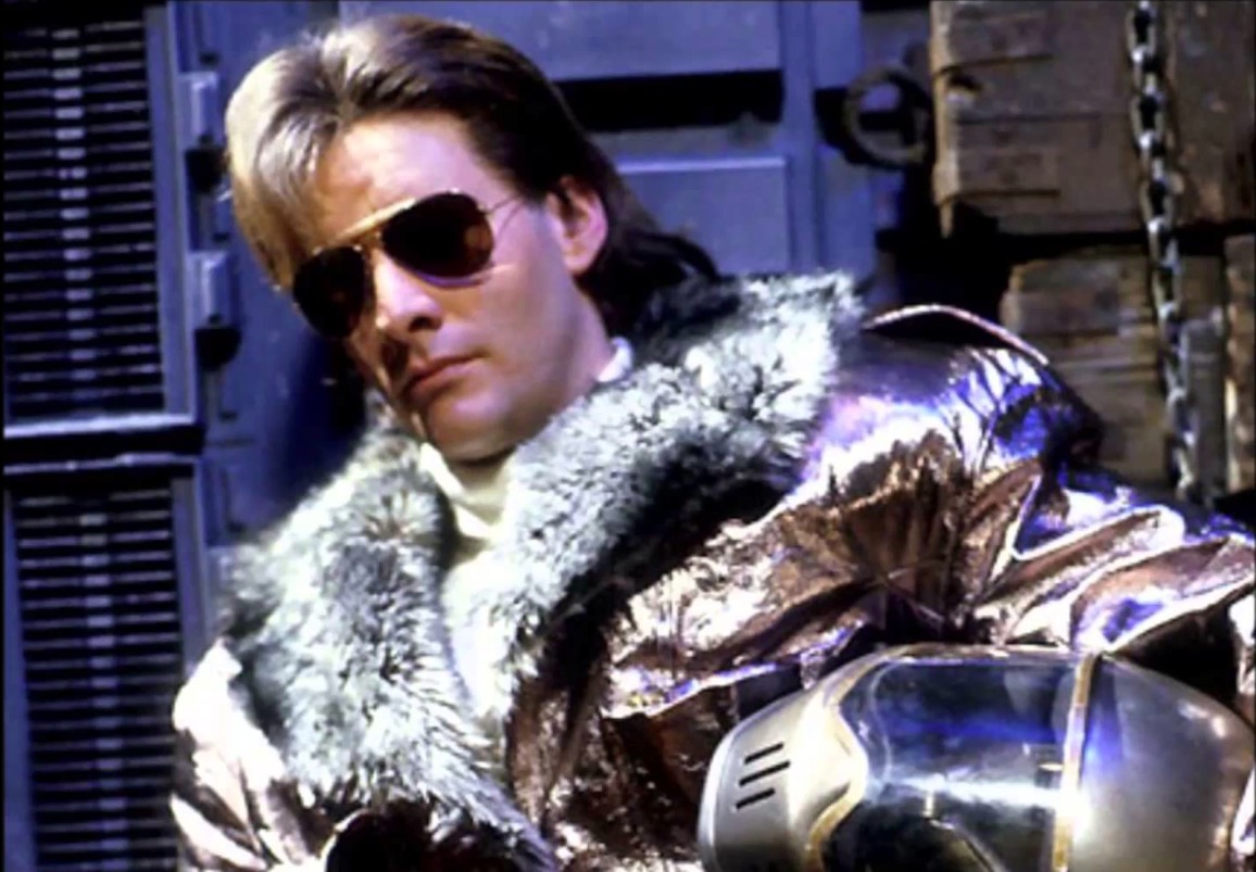 Description: A man in a gold jacket and sunglasses with a helmet on his head and a chain around his neck.
