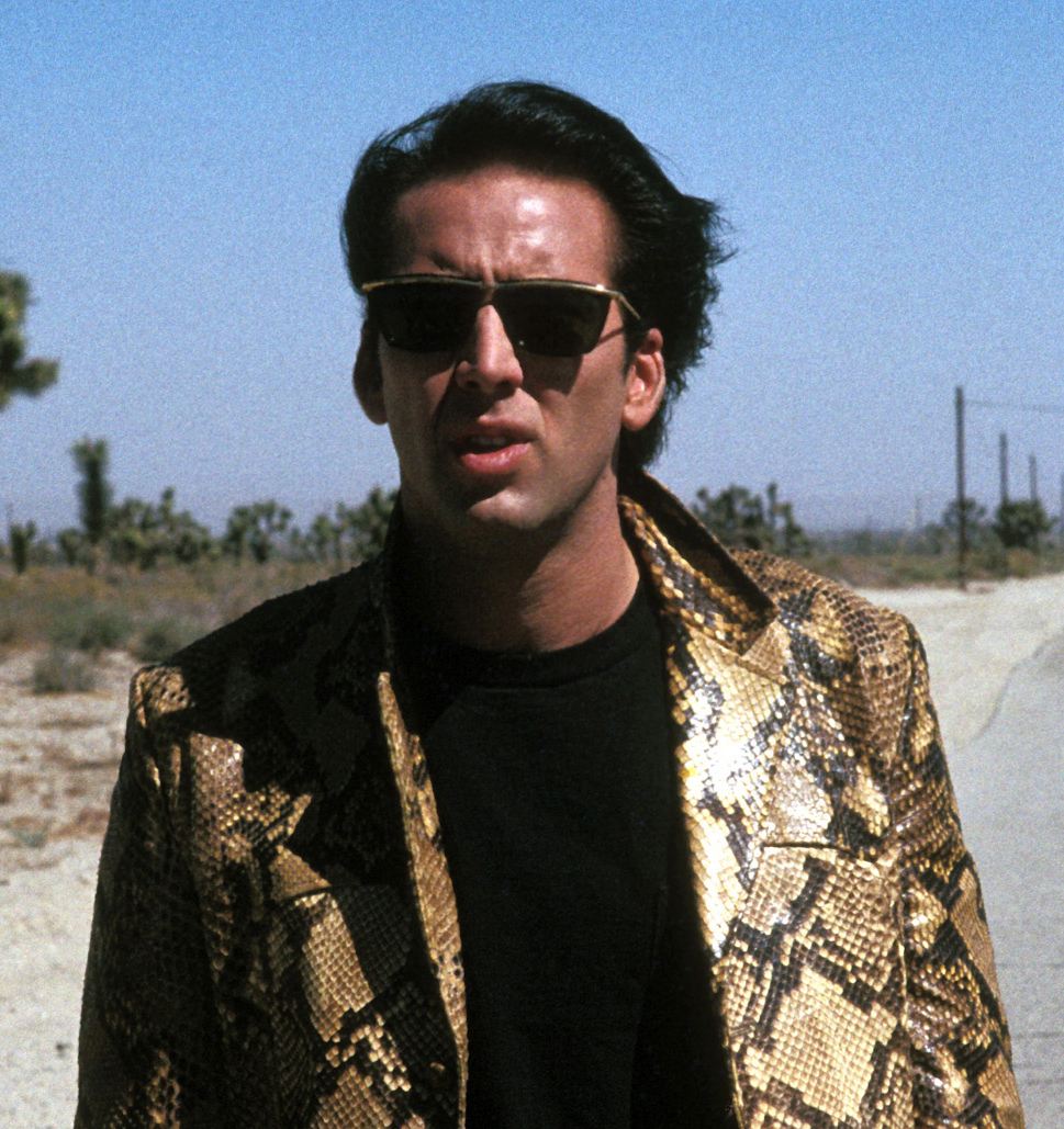 Description: A man in a gold jacket and sunglasses standing on a road with a skateboard in his hand and a palm tree in the background.
