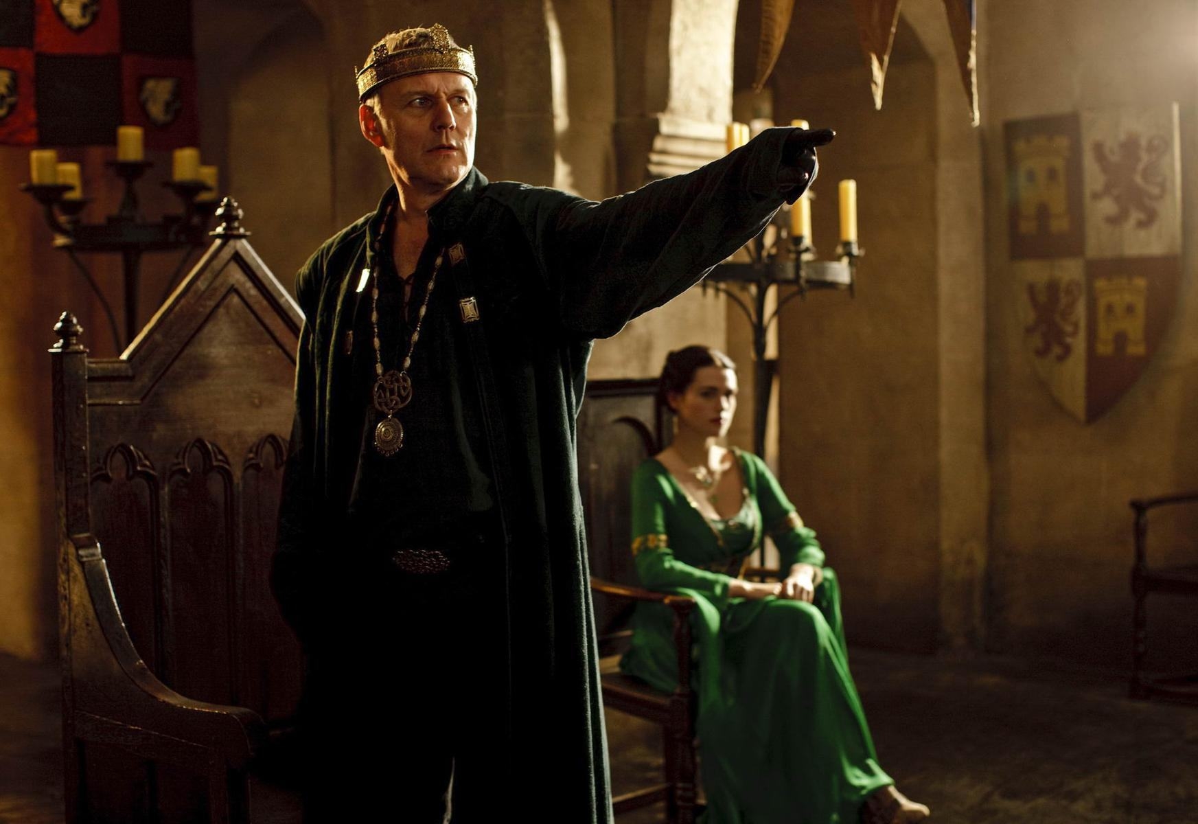 Description: A man in a green dress pointing at something while a woman in a green dress sits in a chair.