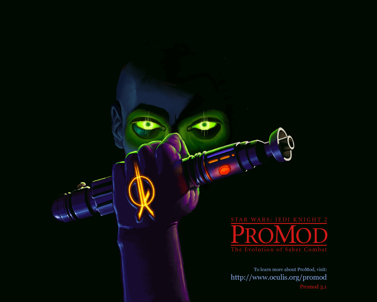 Description: A man holding a flashlight in his hand with green eyes and a demon like face on it's face.