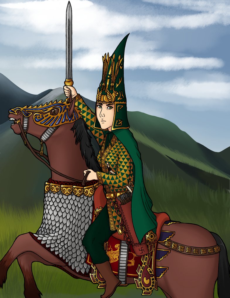 Description: A man in a green and gold outfit riding a horse with a sword in his hand and a helmet on.