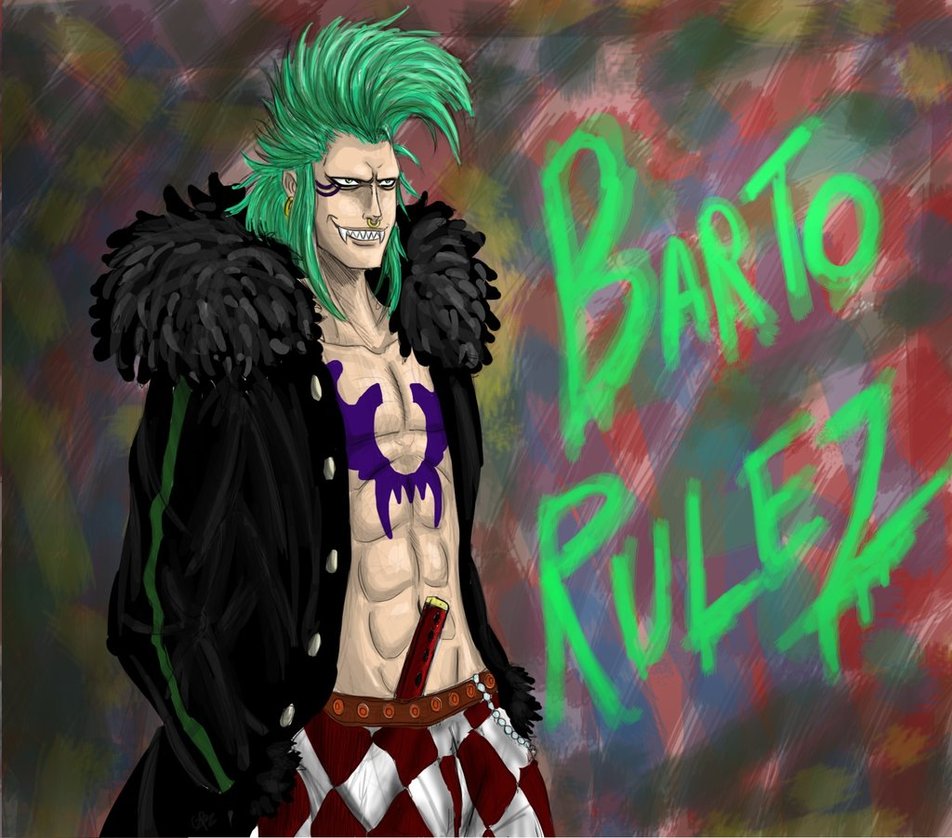 Description: A man with green hair and a jacket on standing in front of a graffiti wall with words that say party rules.