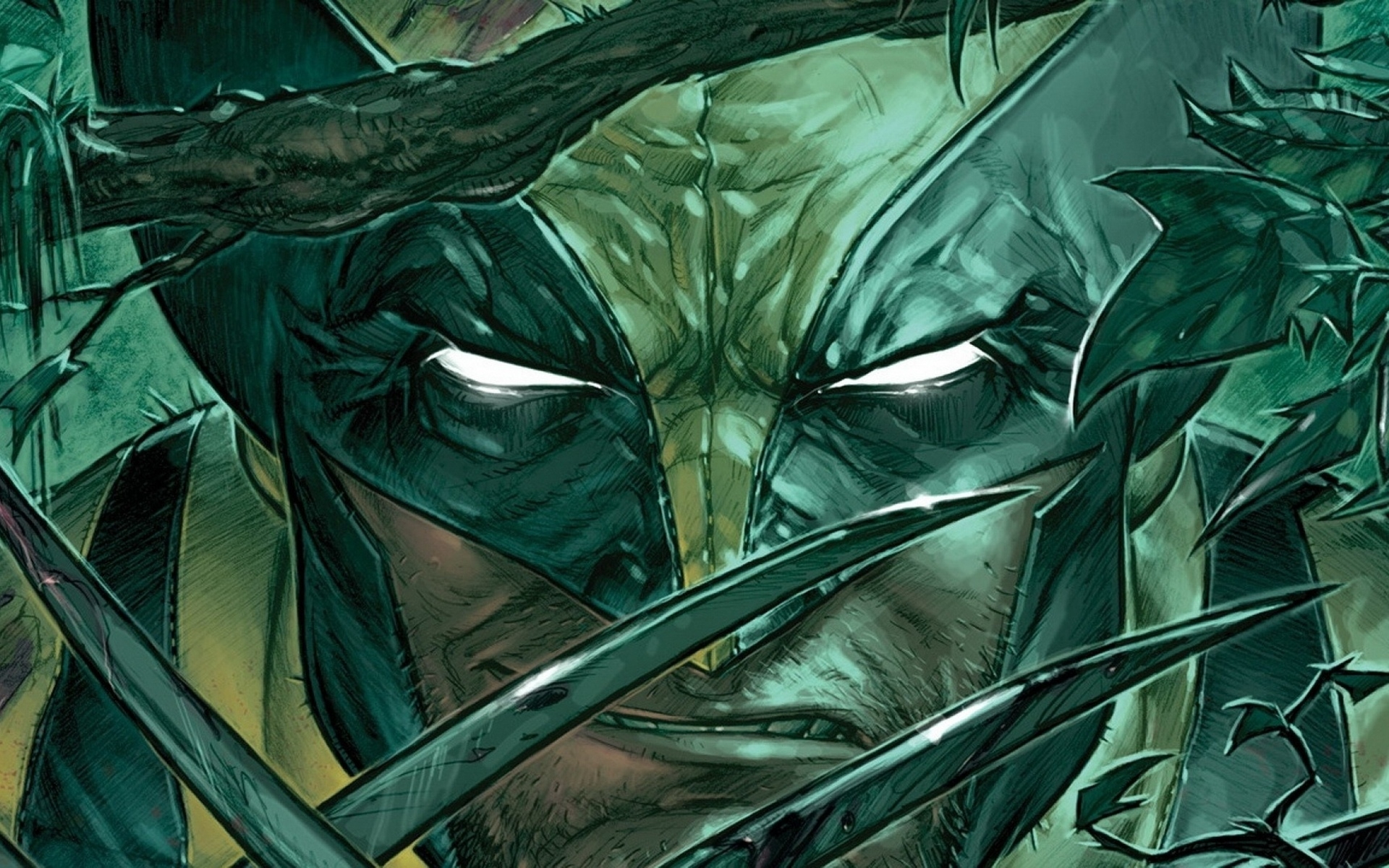 Description: A man with a green mask and a knife in his hand and a tree in the background with branches.