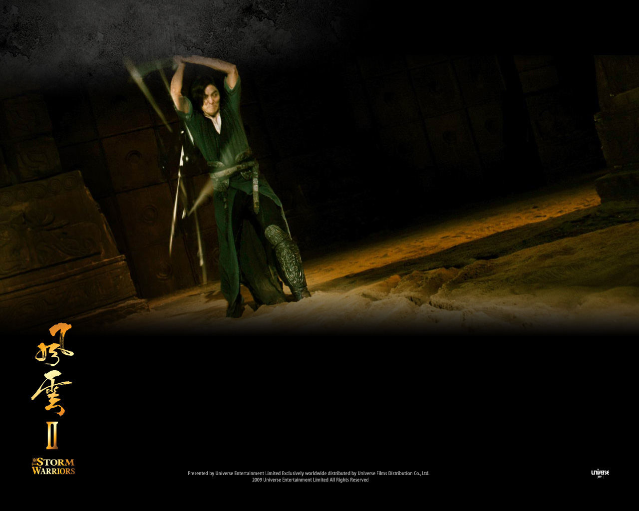 Description: A man in a green outfit holding a sword in a dark room with a dark background and a chinese character.