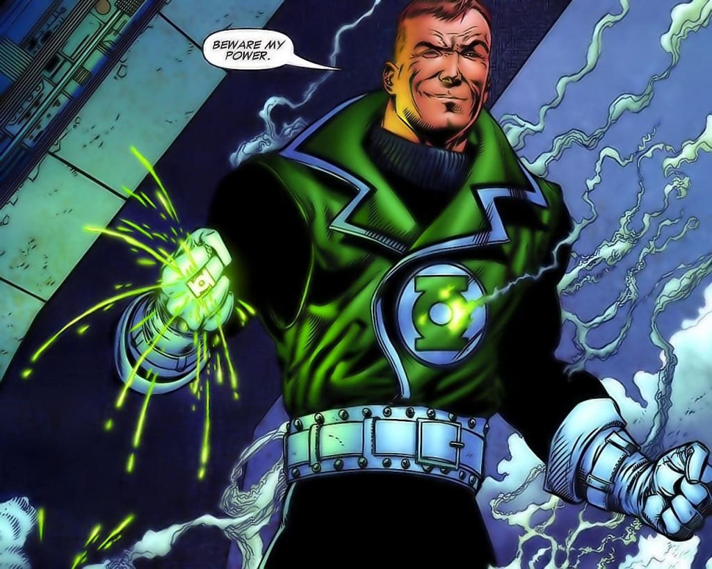 Description: A man in a green suit holding a green light up hand and a comic bubble above his head and a comic bubble above his head.