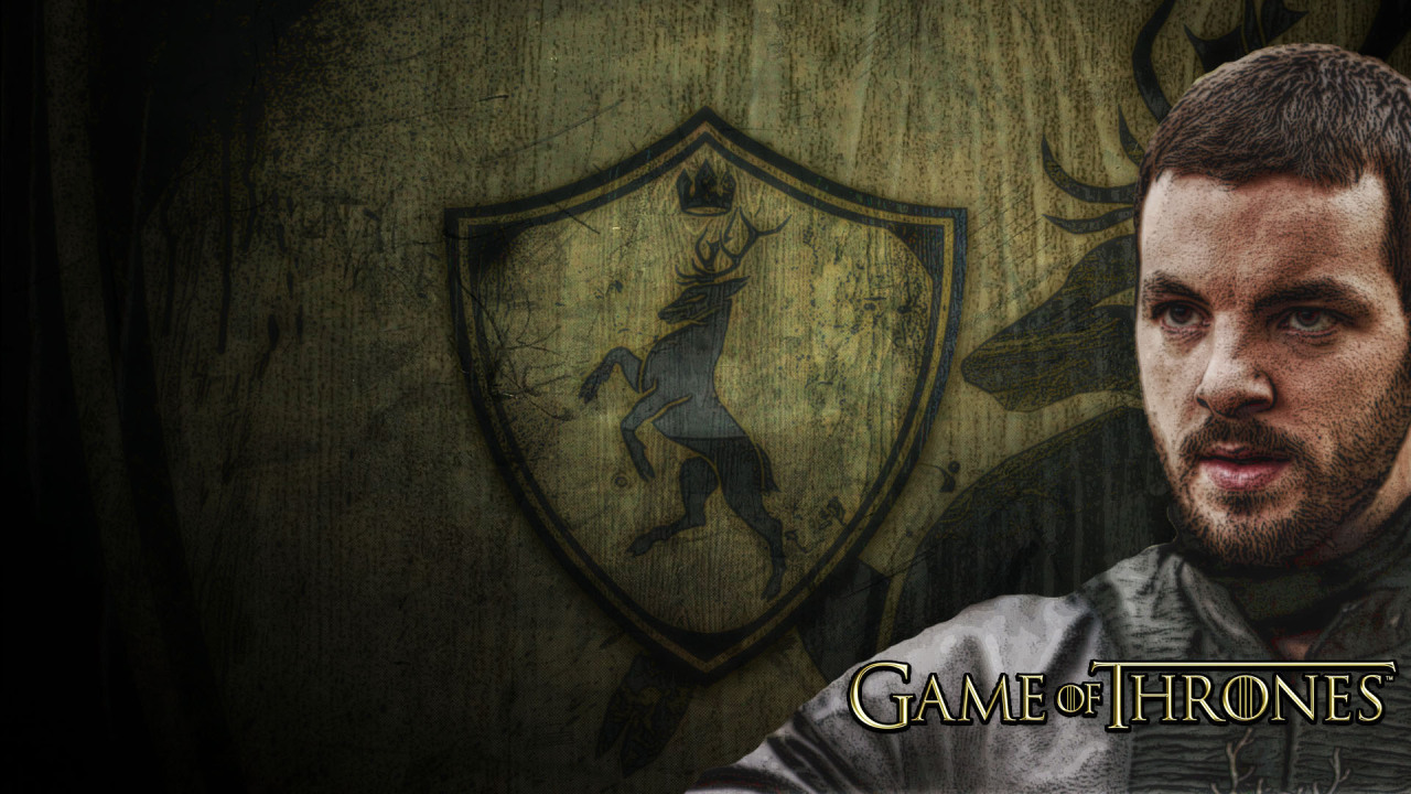 Description: A man in a grey shirt is standing in front of a wooden wall with a shield on it and a game of thrones logo.