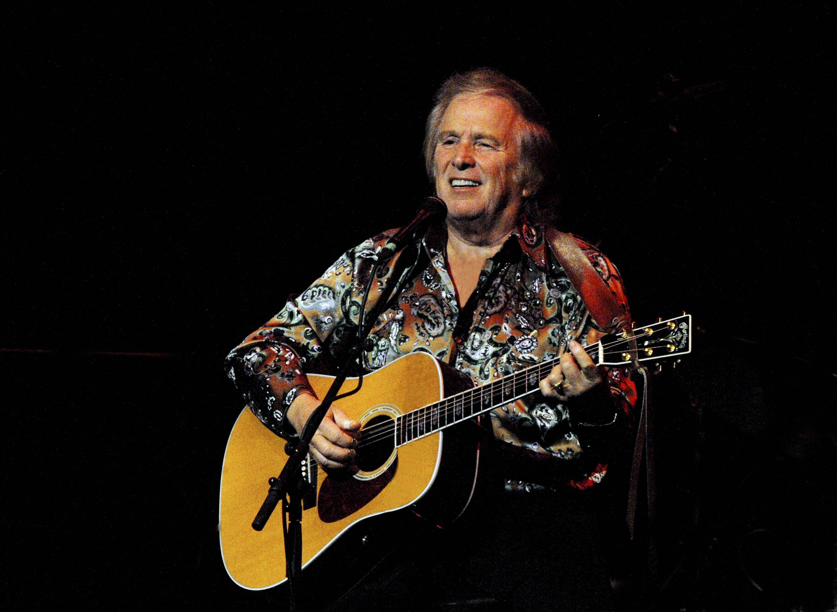 Description: A man with a guitar on stage at a concert with a microphone and a microphone in his hand and a microphone in his other hand.