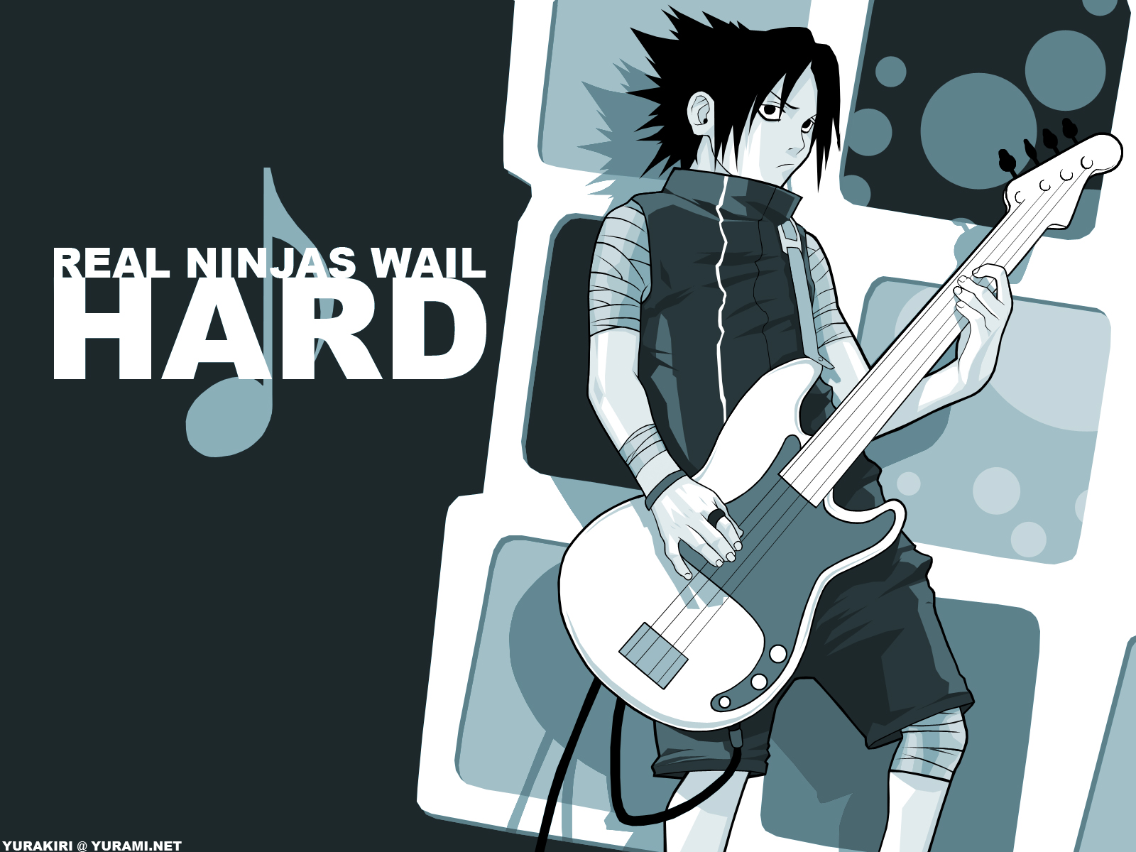 Description: A man with a guitar standing in front of a wall with music notes on it and the words real ninjas wall hard.