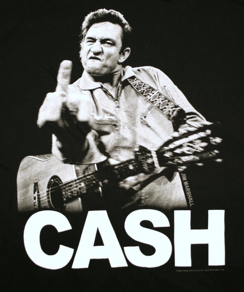 Description: A man holding a guitar and making the peace sign with his hand while wearing a shirt that says cash.
