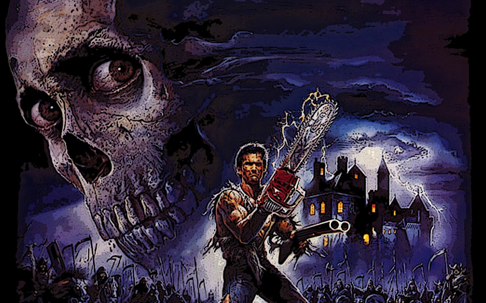 Description: A man with a guitar in front of a skull with a house on it and a cemetery in the background.