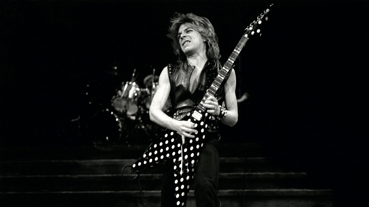Description: A man with a guitar on stage with a polka dot tie around his neck and a microphone in his hand.