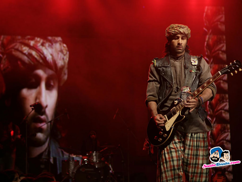 Description: A man with a guitar standing in front of a picture of a man with a beard and a bandana.
