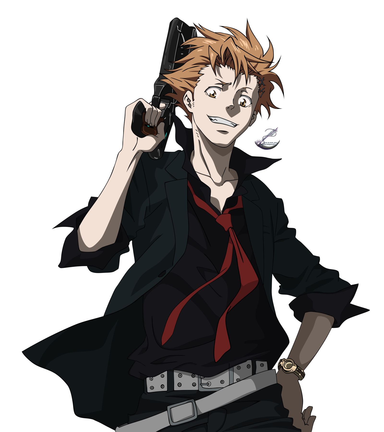 Description: A man with a gun in his hand and a black background with a red shirt and a black coat.