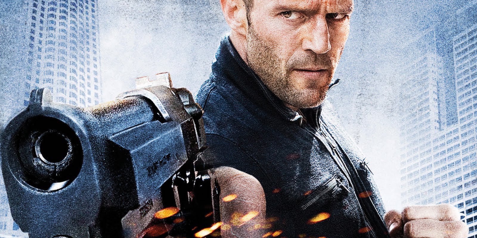 Description: A man holding a gun in his hand in front of a city background with skyscrapers and buildings in the background.